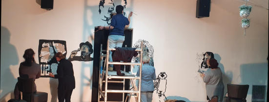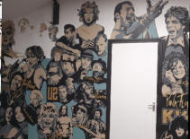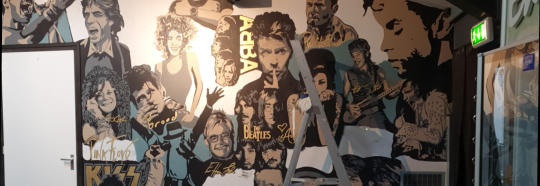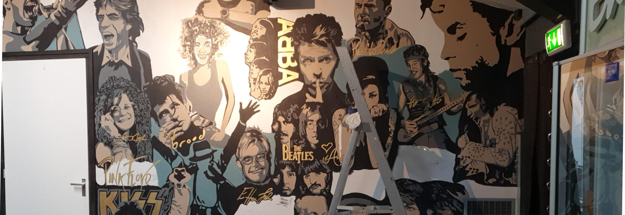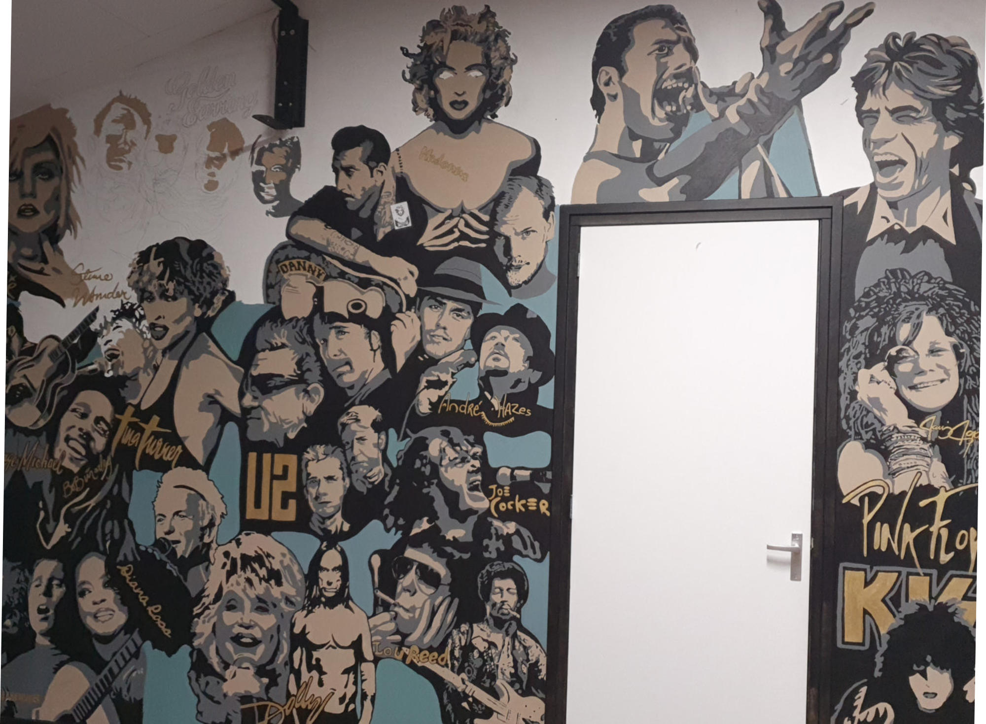 Muziek historie 28 december 2020  starten we in het plaatselijke  café de Rode Leeuw aan een intensief en tijdrovend project,  er komt in de zaal een “Wall of Fame”  van legendarische muziekhelden. De foto’s bewerk ik met Photoshop en teken deze vervolgens op de muur.  Ieder portret wordt met de hand op de muur geschilderd. De kleuren  die we gebruiken voor de portretten zijn zwart, grijs en warm grijs  en de achtergrond in een grijs-petrol kleur, de teksten schilderen  we met goud verf. De eigenares van het café en behulpzame vriendinnen staan me bij  in deze uitdaging, ik zwaai met de scepter, jij doet dit en jij doet dat,  en hopla daar gaan we.  Soms is het muisstil ieder in zijn eigen bubbel,  of we kletsen en lachen veel!! Natuurlijk luisteren we onderwijl  naar de muziek van ieder die op de muur vereeuwigd wordt.  Terwijl we middenin deze covid pandemie zitten wordt onze vrije tijd  prima besteed en geeft het ons allemaal een heerlijke afleiding.  Er zijn momenten geweest dat we met 9 personen aan het schilderen waren,  sommige parkeerde uit voorzorg hun fiets in de garderobe. Een aantal keren zijn we ook met een groepje blijven eten in de avond,  om na de maaltijd weer verder te schilderen aan de muur.   Maar helaas de regels van hoger hand worden strenger,  we besluiten nu om met hooguit vier personen verder te schilderen, om zo de 1,5 meter bij de muur te kunnen waarborgen.  Dus in overleg verdelen we de opkomst om  de groep niet al te groot te maken,  voorzichtigheid geboden! want het corona virus ligt op de loer.   Als je nagaat dat iedere afbeelding zo’n 16 uur werk op eist,  is het eraan werken met 4 personen een beetje weinig,  het schiet maar niet op!   En dan ook nog die avondklok, we schilderen van half zeven  tot kwart voor negen, opruimen en weg wezen!!  Het is nu maart en het einde komt langzaam in zicht,  gestaag schilderen we door,  ik teken nog een paar laatste toeten op de wand.  Alles wordt nagelopen met nog een laag verf en laag na laag na laag… Het geduld wordt hierdoor behoorlijk op de proef gesteld  en dat resulteerde soms tot het afraffelen van de portretten  en dat is juist wat niet de bedoeling is,  het herstel daarvan kost ook weer  de nodige uren om het dan toch weer naar mijn zin te krijgen. En dan gaat tot overmaat van ramp het corona virus ook nog roet  in het eten gooien, want door positief geteste ligt  de voortgang van de muur 3 weken stil. Inmiddels hebben we de penselen weer opgepakt en gaan we ons  weer focussen op dit schilder project.  Al met al maken we heel wat mee met elkaar en niet alles gaat  van een Leien dakje!!